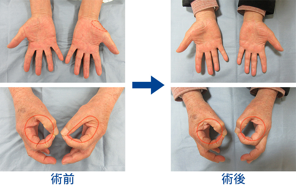 時間のかかる治療ですので、すぐに親指を動かせるようになりたいという場合には、腱移行術を同時に行なうことも可能です。